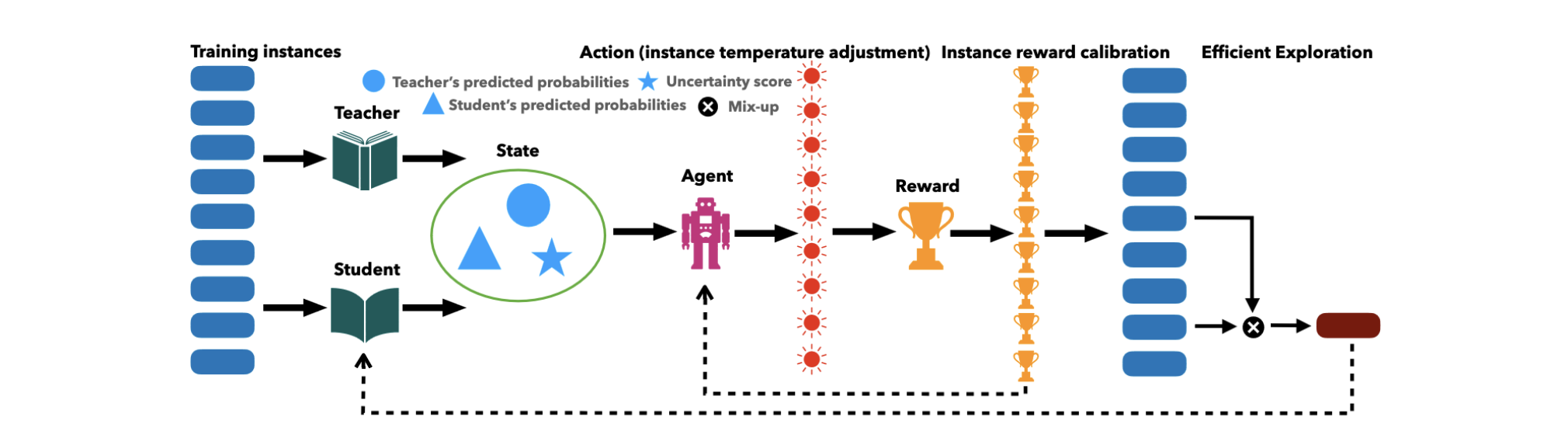 Solid lines represent the processing flow of the training instances in our framework, and dashed lines indicate the backpropagation process used for model (student model and agent) updates