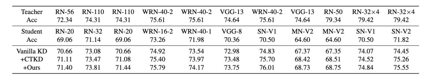 Student network top-1 accuracy on CIFAR-100. Testing the performance of Vanilla KD as well as Vanilla KD with the incorpora- tion of instance temperature adjustment using CTKD and our RLKD, respectively